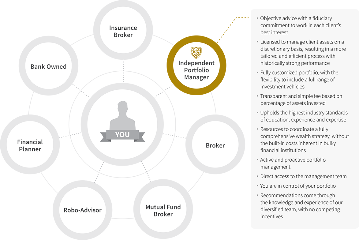 Because of the complex nature of many types of investments and services, it can be challenging to identify exactly how much you’re paying to invest. That’s why we begin with a complimentary review of your current portfolio, and a cost-benefit analysis of the growth you’re seeing versus the trailer fees, commissions and other hidden costs. As independent Portfolio Managers, the fee for our service is fully transparent, and based on a percentage of total assets invested.